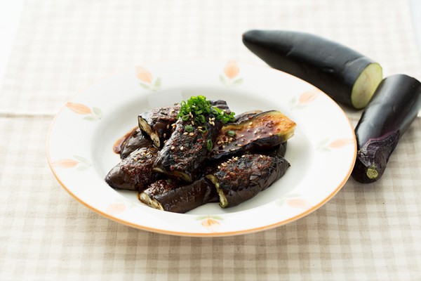 4. 프라이팬 올리브오일을 두르고 앞뒤로 가지를 넣어 노릇노릇하게 구워 그릇에 담고 양념장을 뿌린다.