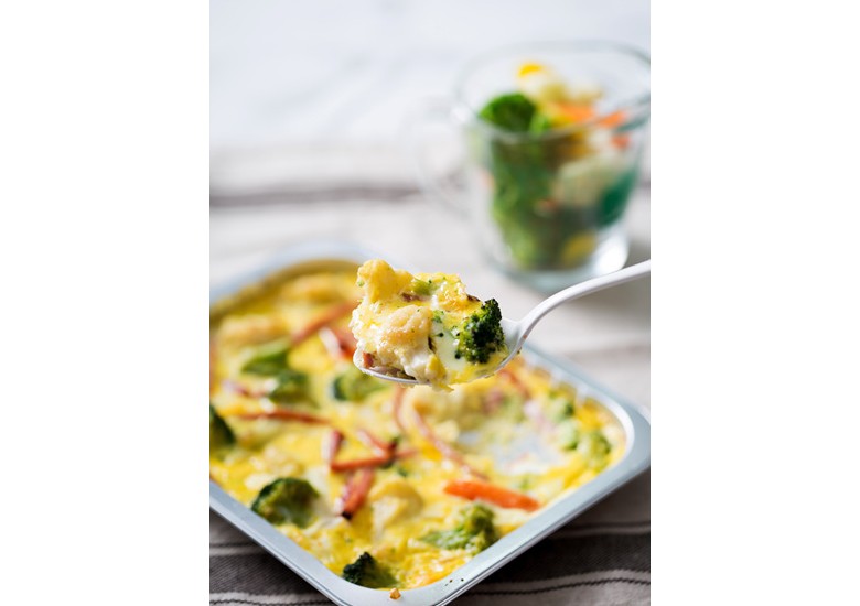 4. 오븐팬에 볶은 재료와 달걀 우유물을 붓고 180℃로 예열한 오븐에 20분 정도 굽는다.
