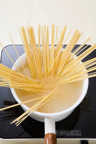 1. 끓는 물에 소금을 약간 넣고 스파게티를 삶아 체에 건져 물기를 뺀다.