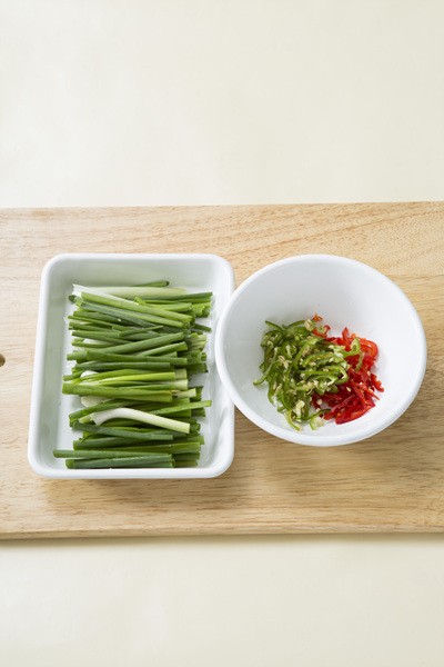 1. 실파는 씻어 5cm 길이로 썰고 청양고추와 홍고추는 반으로 썰어 송송 썬다.
