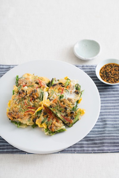 4. 프라이팬에 식용유를 두르고 실파를 올리고 청양고추와 홍고추를 뿌리고 홍합살을 한 숟가락씩 얹는다. 달걀을 한 숟가락씩 올려 앞뒤로 노릇노릇하게 지진다.