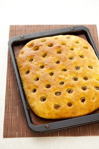 5. 오븐팬에 펴서 일정한 간격으로 손가락으로 누른 다음 올리브를 얹고 올리브오일을 바른 후 로즈메리를 뿌린다.