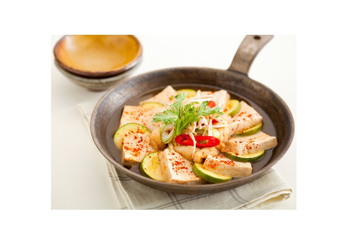 1. 두부는 1cm 두께로 먹기 좋게 썰고 애호박은 원형으로 도톰하게 썰고 팽이버섯은 밑동을 자른다. 대파와 청고추 홍고추는 어슷하게 썬다.